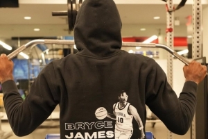 詹姆斯晒出了一组个人训练照,在其中多张照片中,他身穿印有小儿子布莱斯形象的定制连帽衫。
